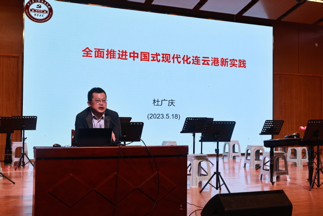 本次活動由市委宣傳部、市委黨校、市文廣旅局、市文聯(lián)主辦,市演藝集團、連云港師范高等??茖W(xué)校承辦。活動伊始,現(xiàn)場觀眾共同觀看了《2022年連云港市先進典型風(fēng)采錄》視頻,充分領(lǐng)略了連云港各條戰(zhàn)線上模范榜樣的道德風(fēng)采。江蘇省道德模范提名、民營連云港德平書店經(jīng)理李文倫作了題為《以平凡的崗位,立足于一生的奉獻》的宣講,他結(jié)合自身的成長經(jīng)歷,講述了他把三分之一的時間、精力、利潤、圖書投身到公益事業(yè),奉獻給社會,資助留守兒童、貧困生,捐建社會綜合圖書閱覽室等無私奉獻的動人事跡。市委黨校市情研究室主任、副教授杜廣慶作題為《全面推進中國式現(xiàn)代化連云港新實踐》的專題講座,他從堅持推動高質(zhì)量發(fā)展不動搖;堅持科技自立自強不動搖;堅持以人民為中心的發(fā)展思想不動搖;堅持綠水青山就是金山銀山理念不動搖;堅持走中國特色社會主義民主政治發(fā)展道路不動搖;堅持全面推進依法治市不動搖;堅持發(fā)展社會主義先進文化不動搖;堅持深化改革開放不動搖;堅持總體國家安全觀不動搖等方面詳細講解了推進中國式現(xiàn)代化連云港新實踐的路徑及發(fā)展思想。