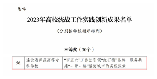 近日,省委教育工委公布了2023年高校統(tǒng)戰(zhàn)工作實踐創(chuàng)新成果遴選結(jié)果,我校申報的《“四五六”工作法引領(lǐng)“紅石榴”品牌 服務(wù)共建“一帶一路”沿海城市的實踐探索》榮獲三等獎。